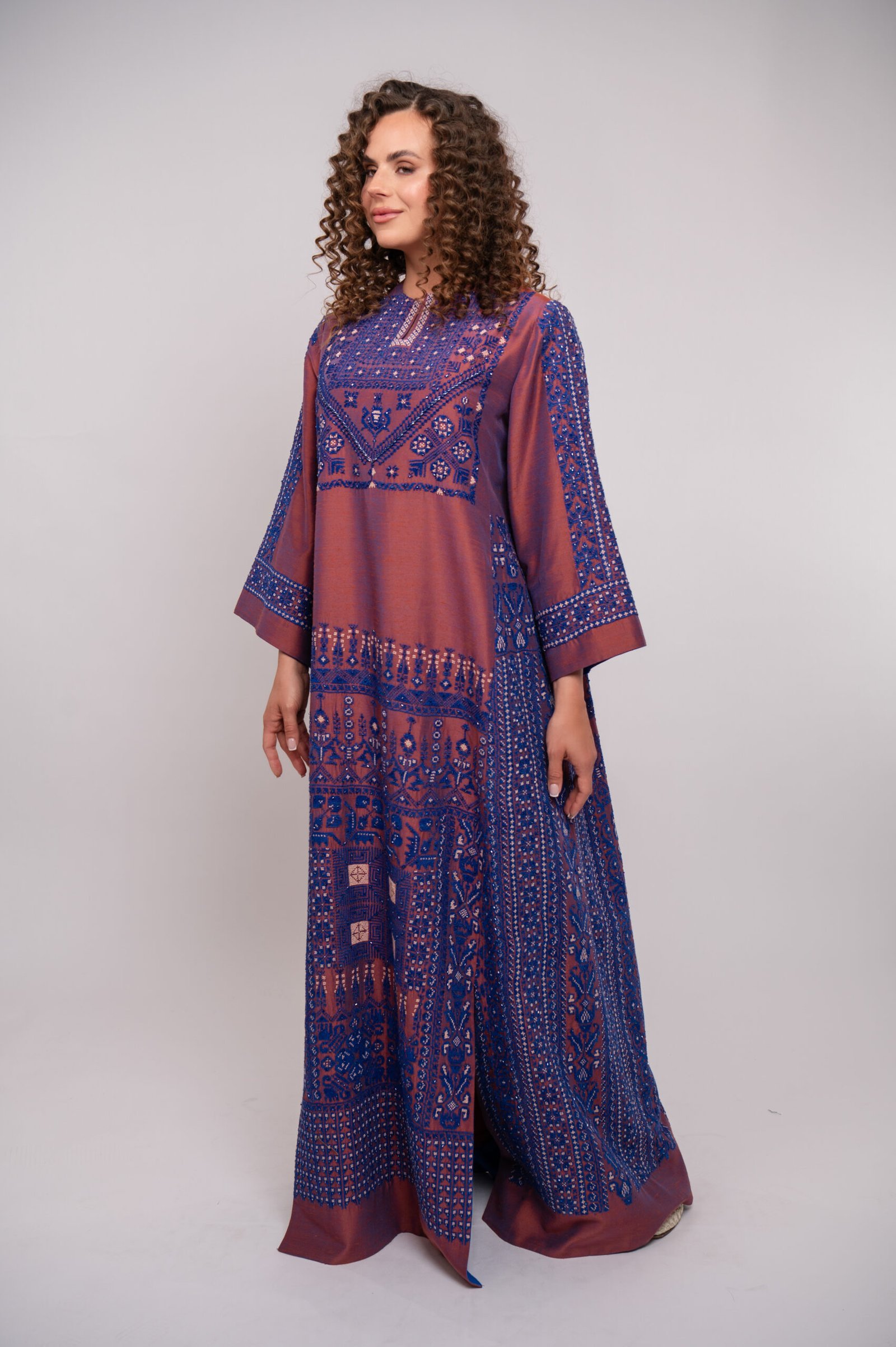 A rich brown thobe adorned with intricate purple hand embroidery and delicate beading — a bold yet elegant tribute to timeless tradition