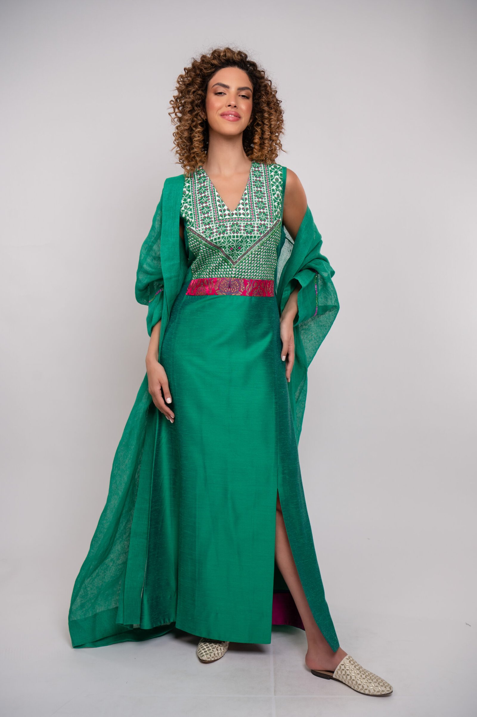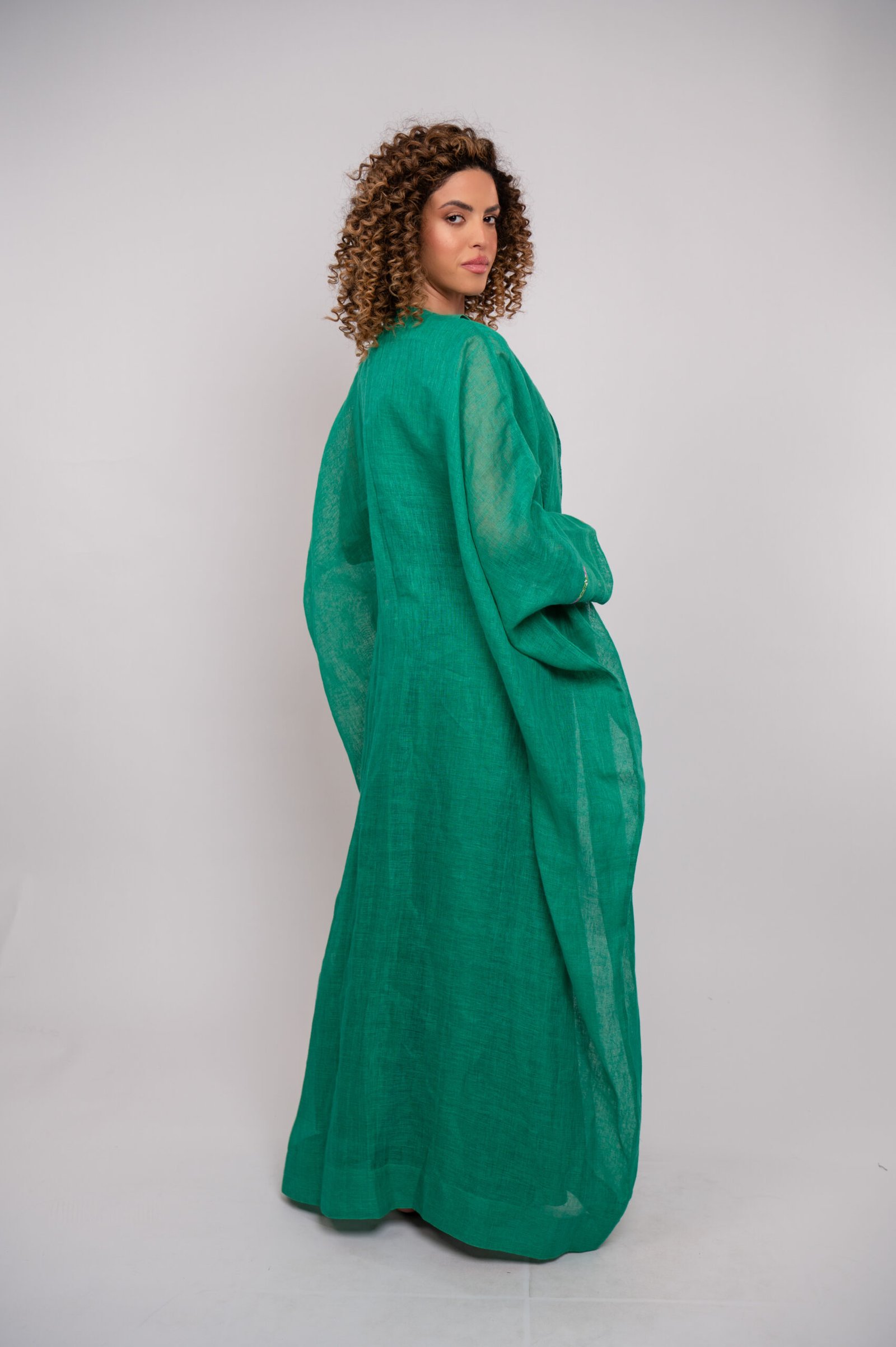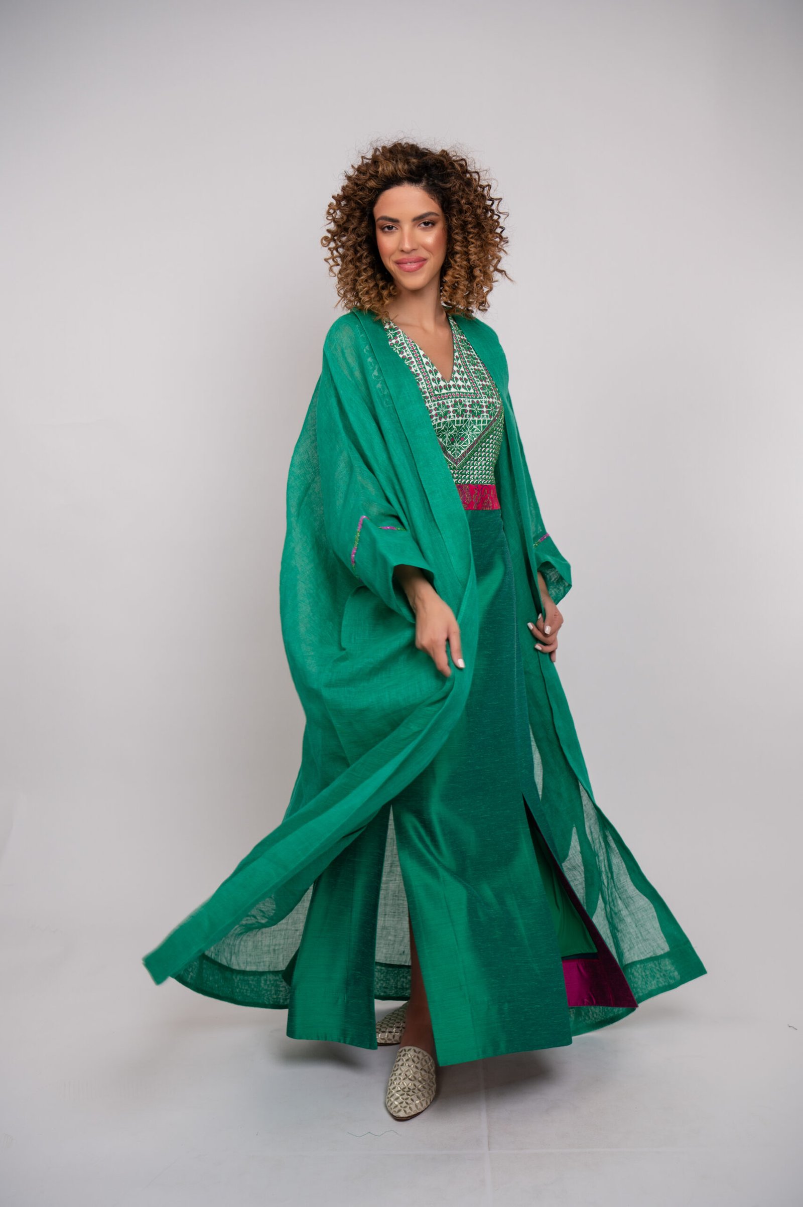 A graceful green thobe adorned with soft pink and green hand embroidery, finished with subtle bead accents for a refined, feminine look