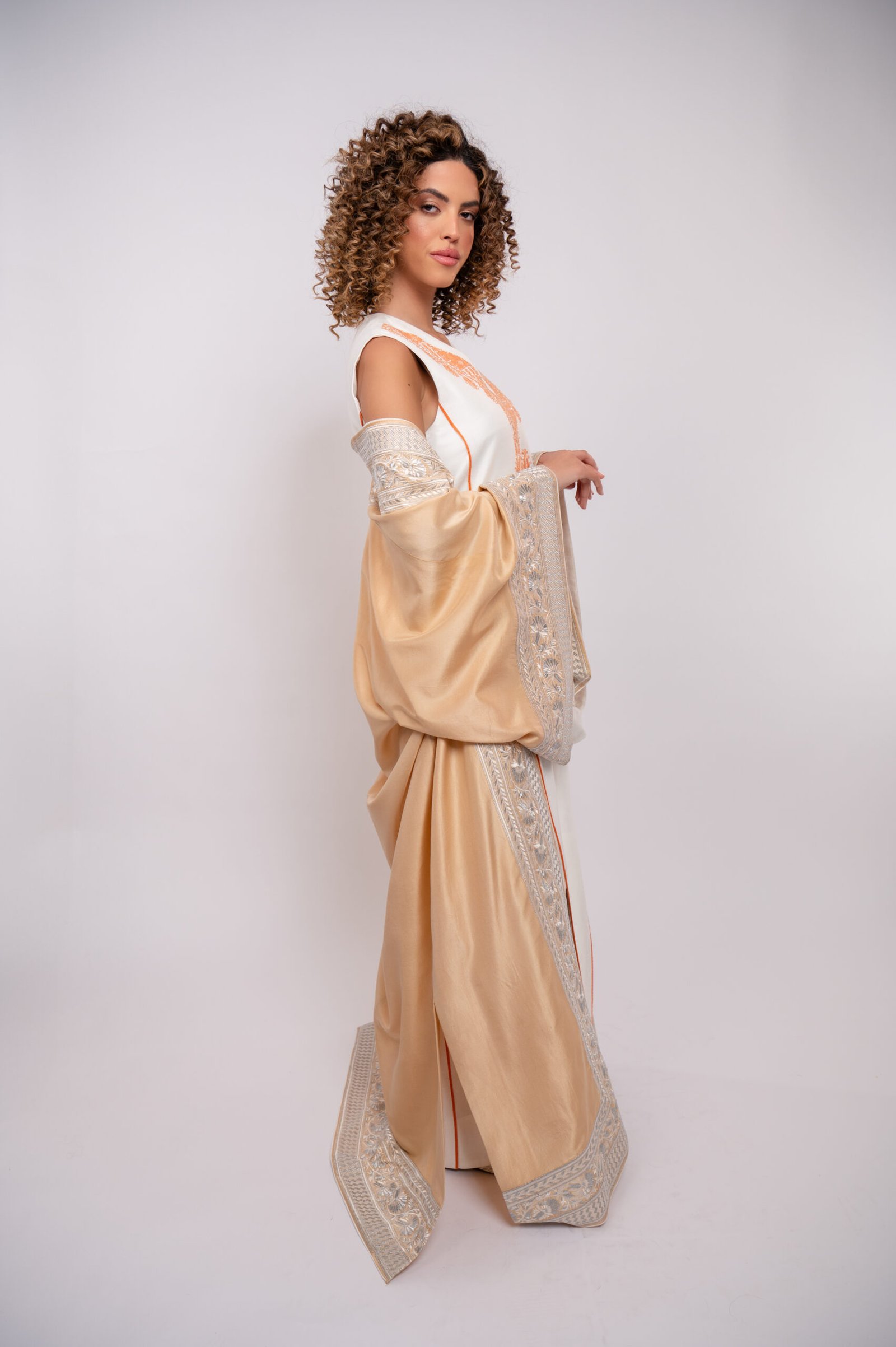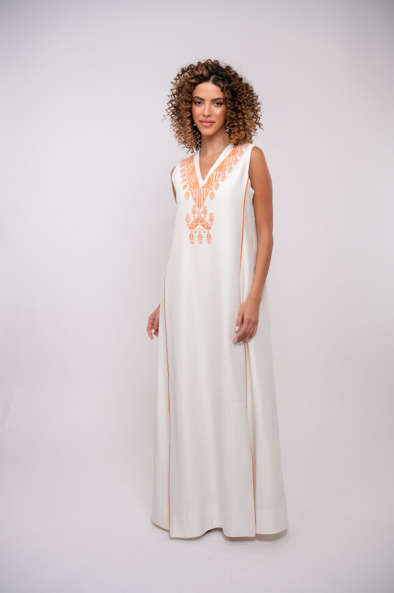 Crisp white thobe adorned with intricate Orange hand embroidery and delicate beadwork, blending tradition with elegance