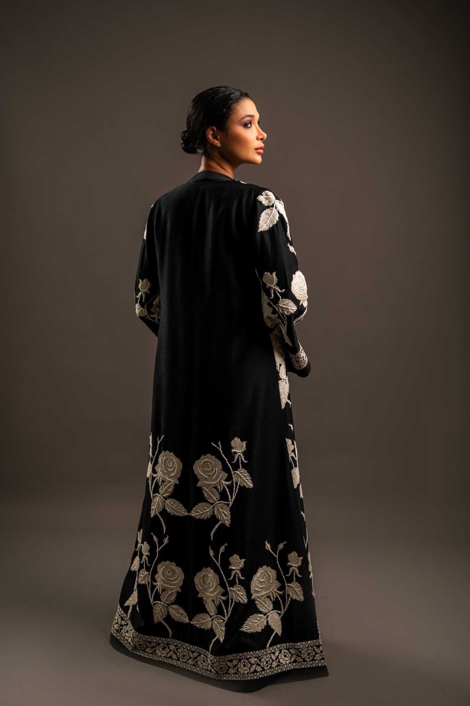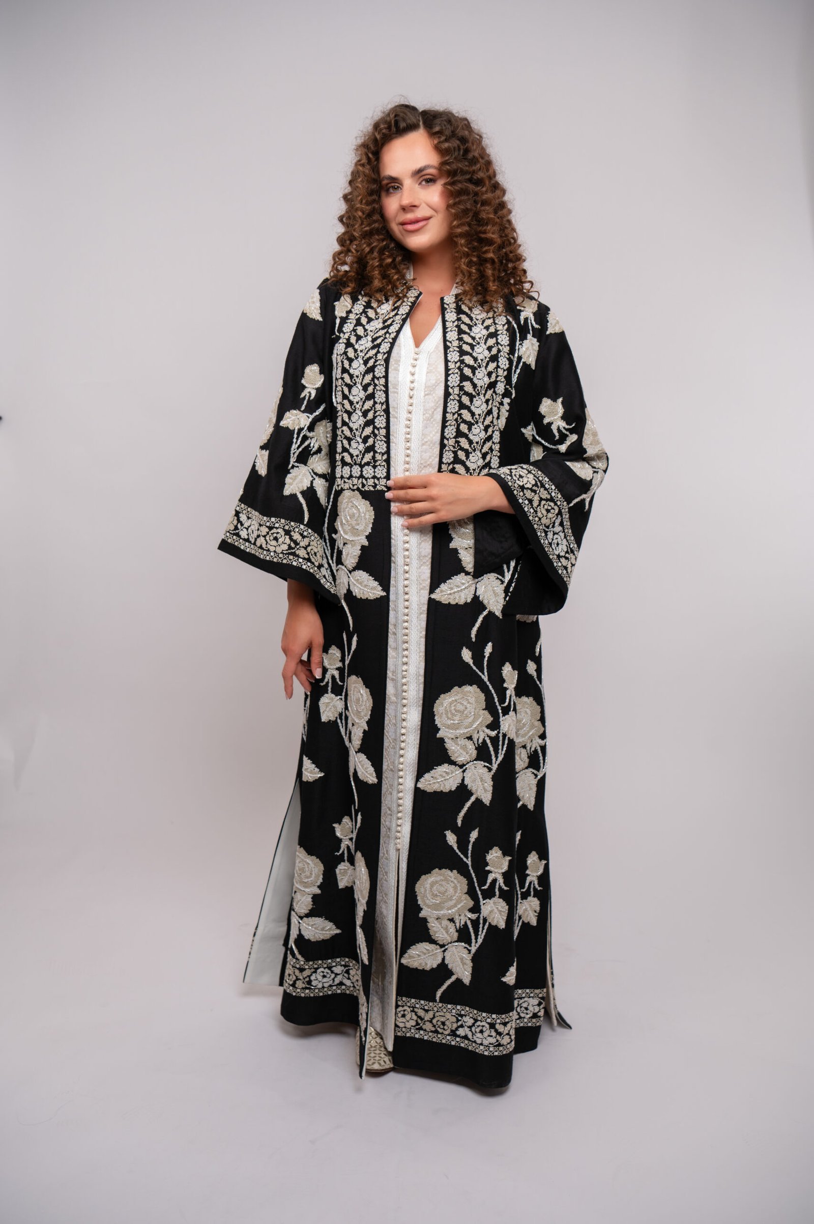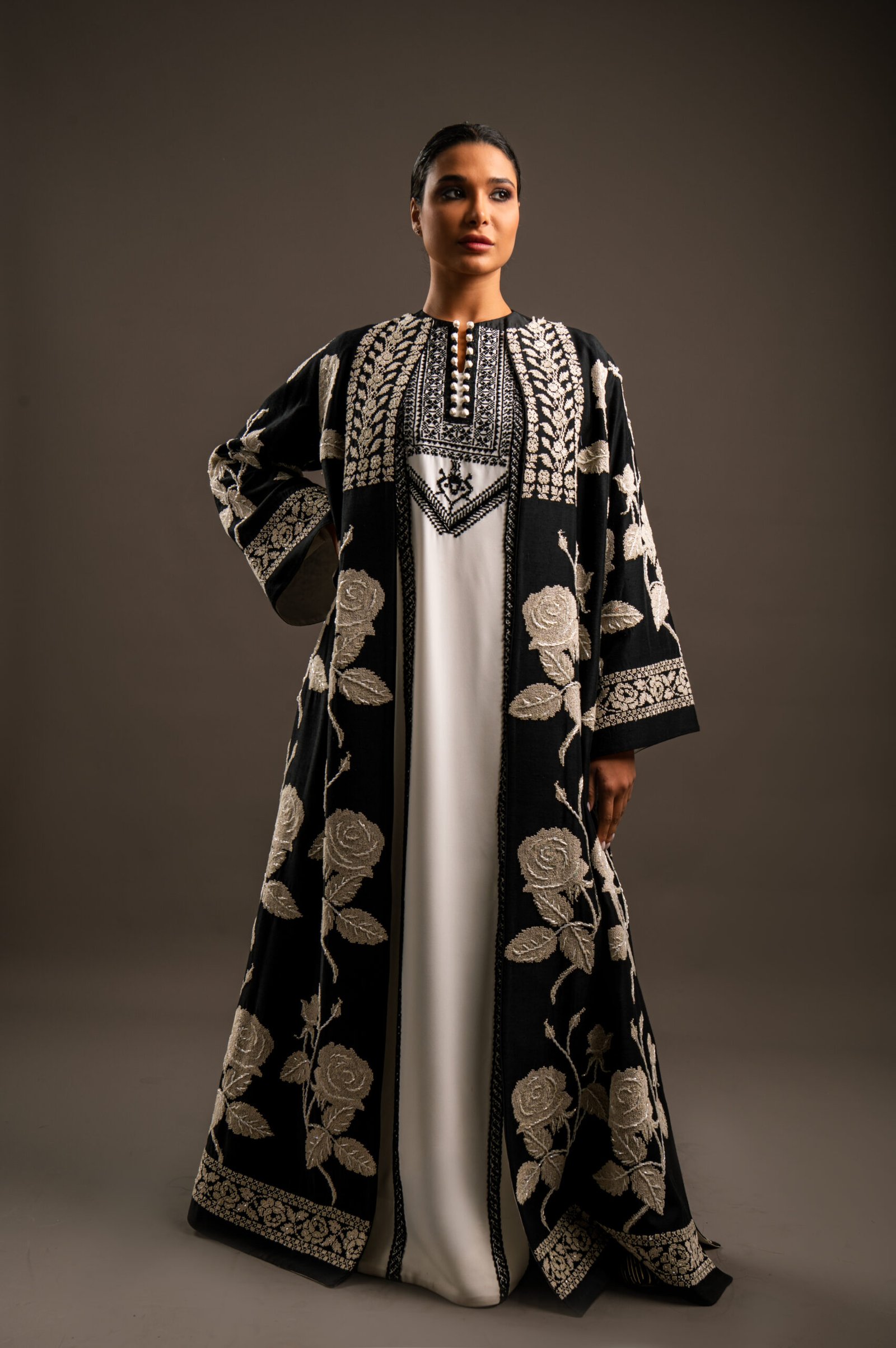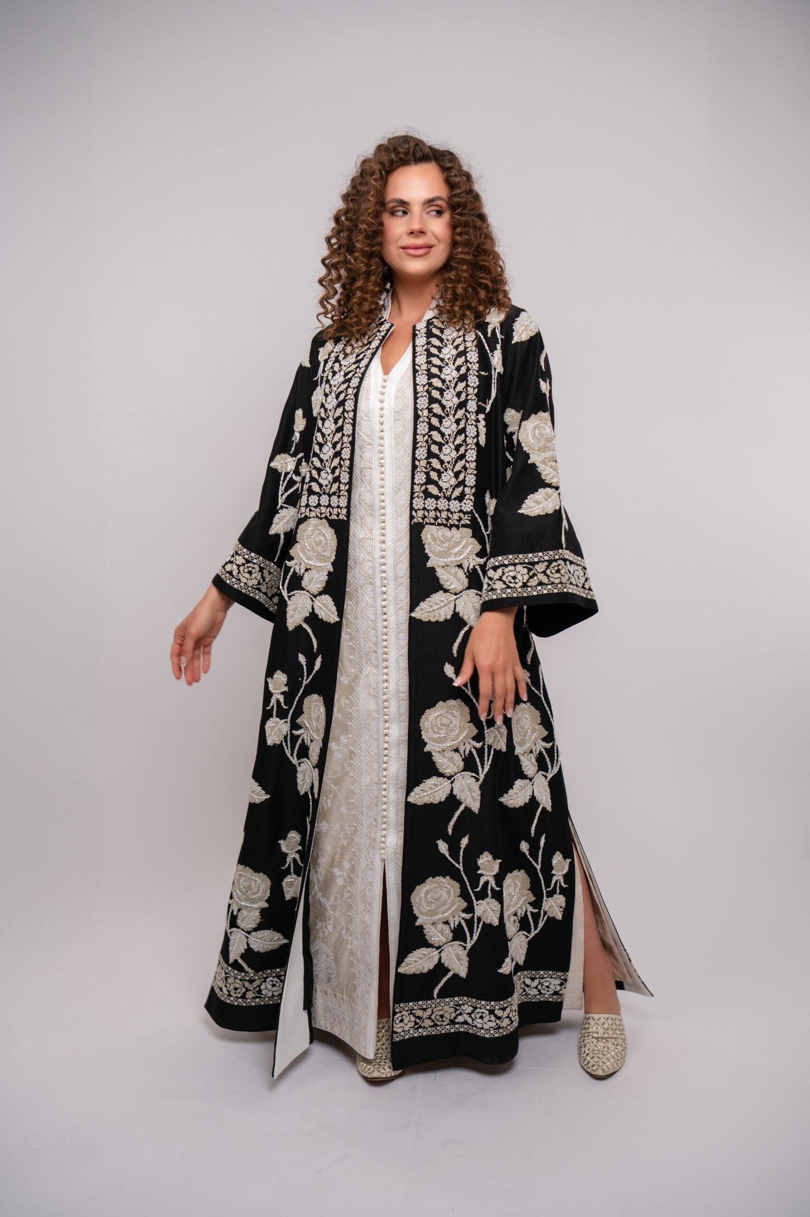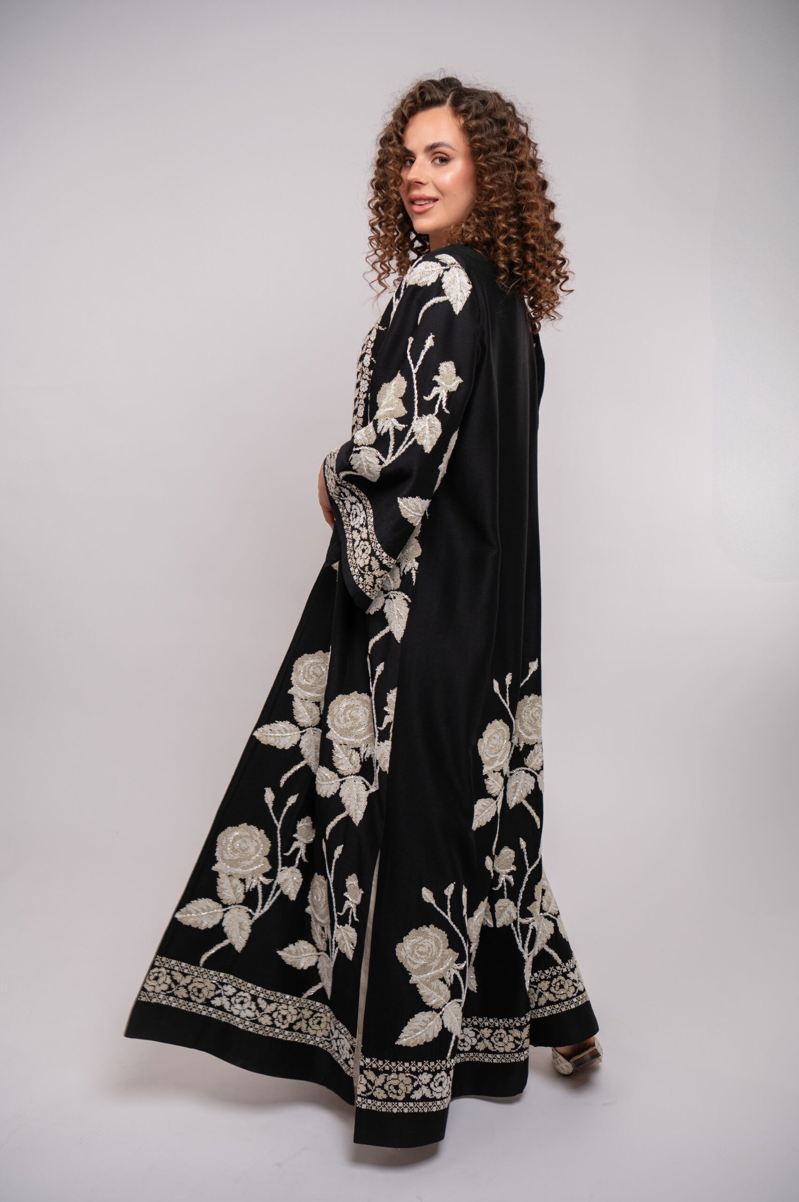 Classic and refined, this black open abaya is elevated with intricate hand embroidery and delicate beading—offering a timeless blend of tradition and  elegance.