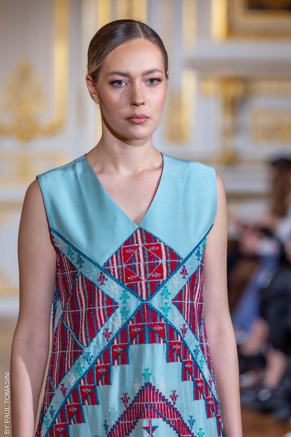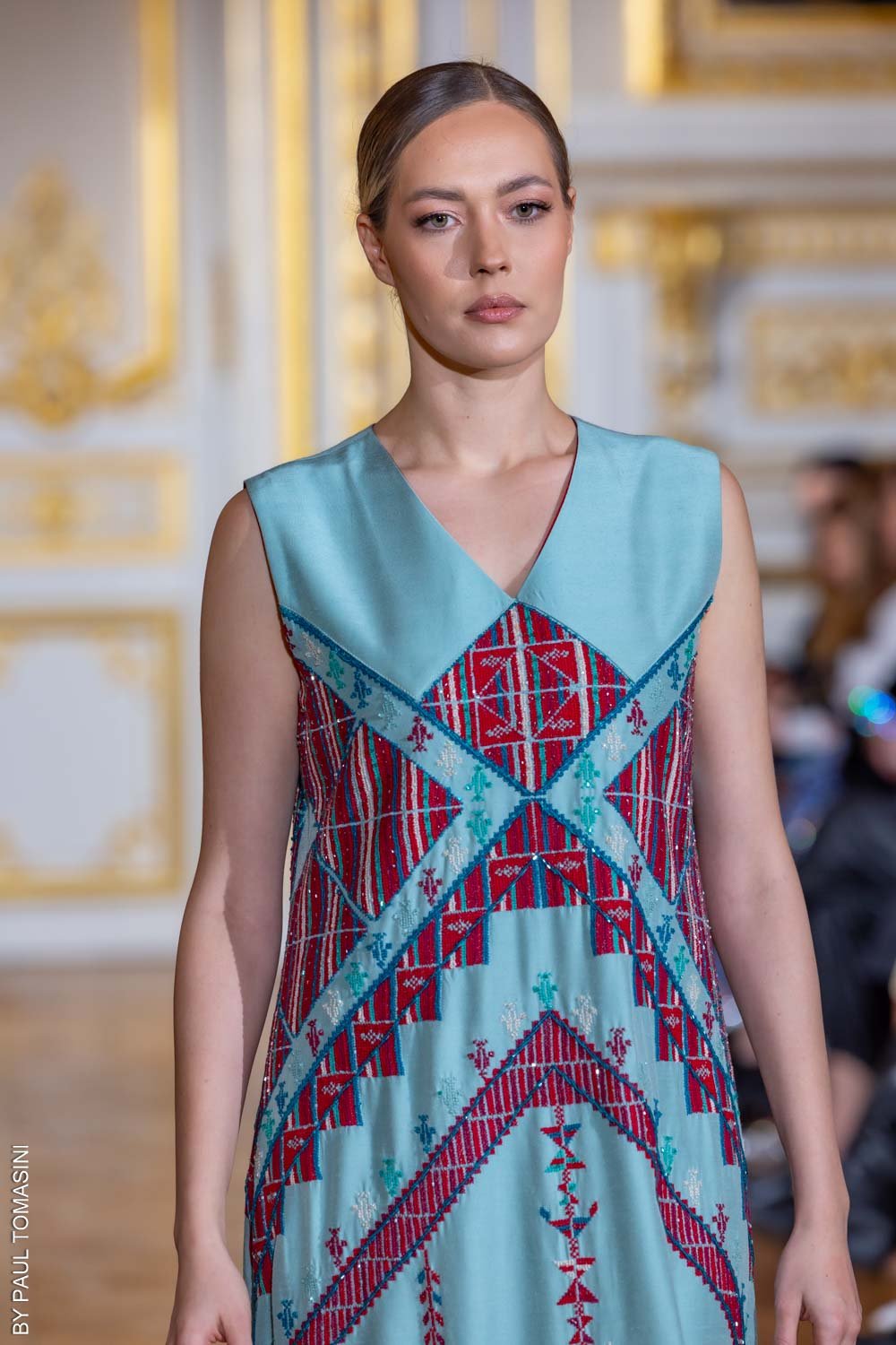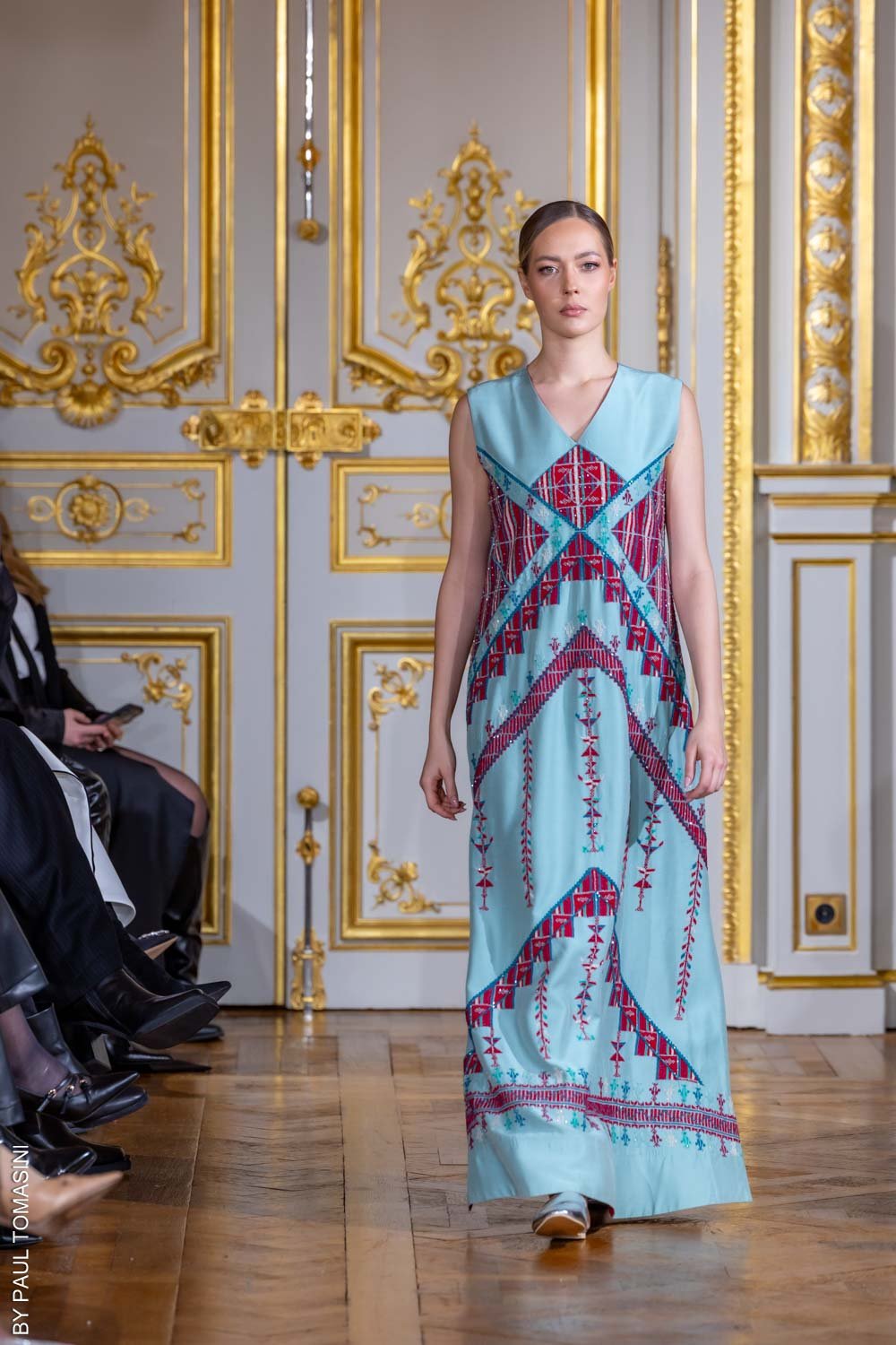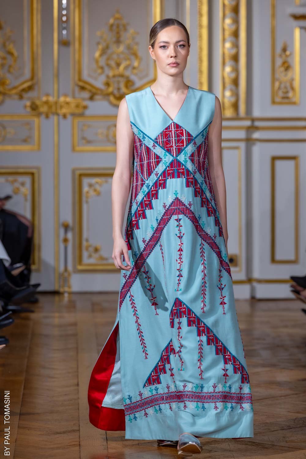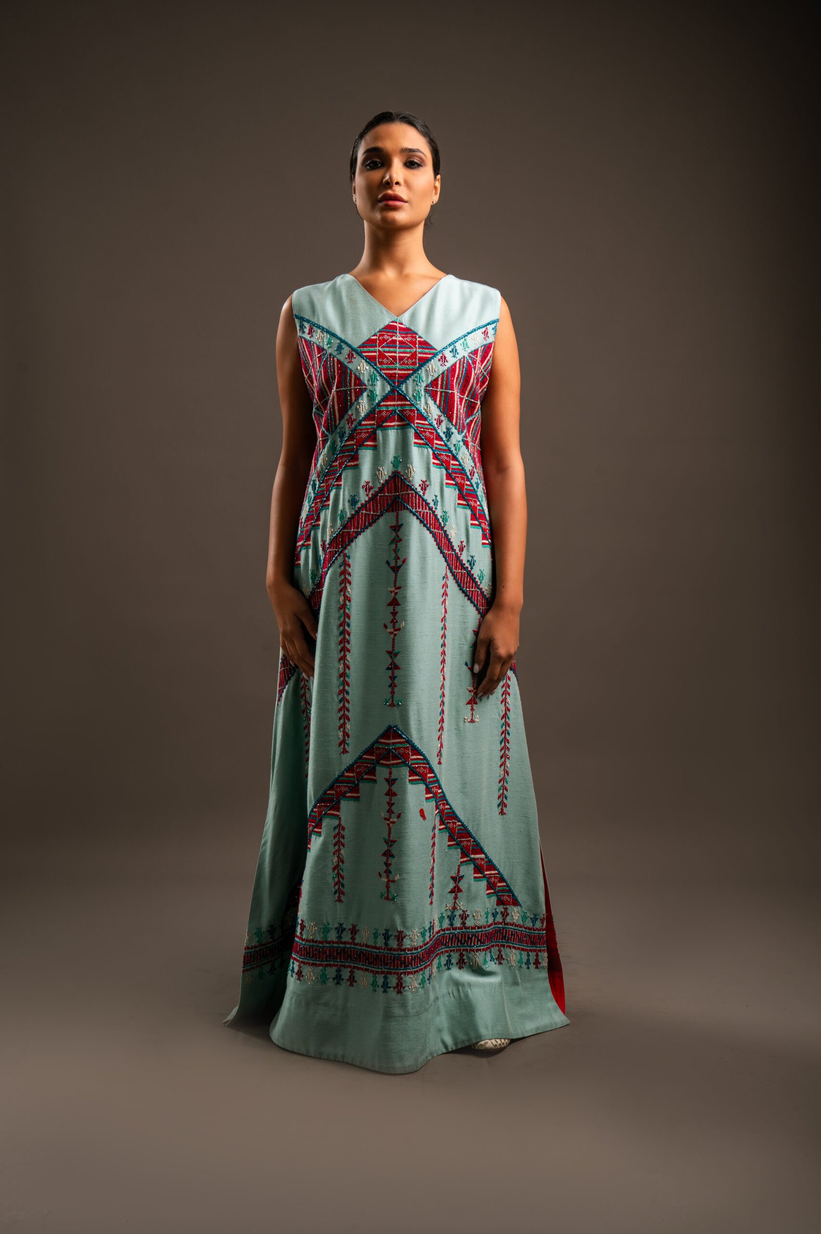 A contemporary silhouette, this blue sleeveless thobe is beautifully detailed with red hand embroidery and beadwork, blending elegance with modern charm.