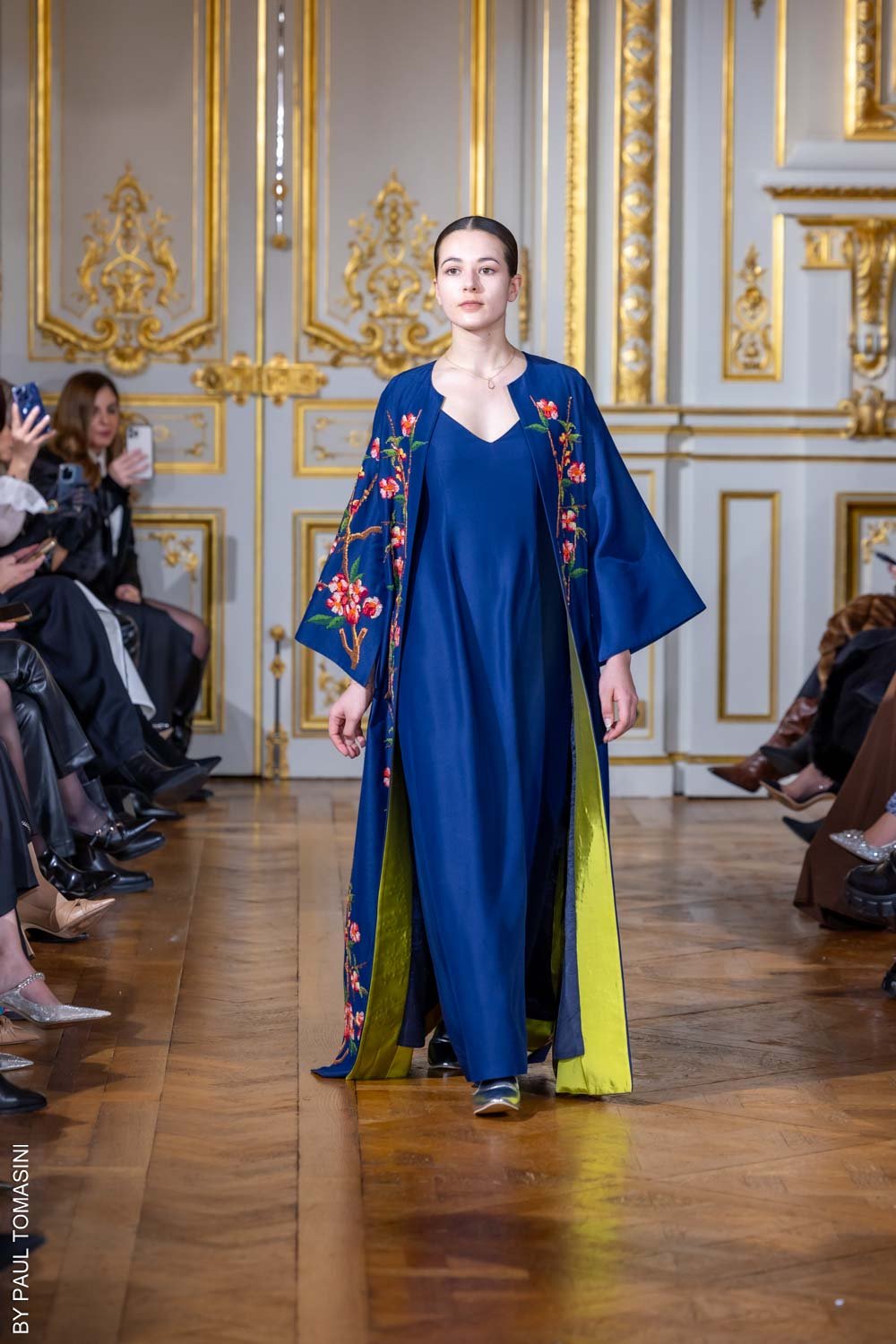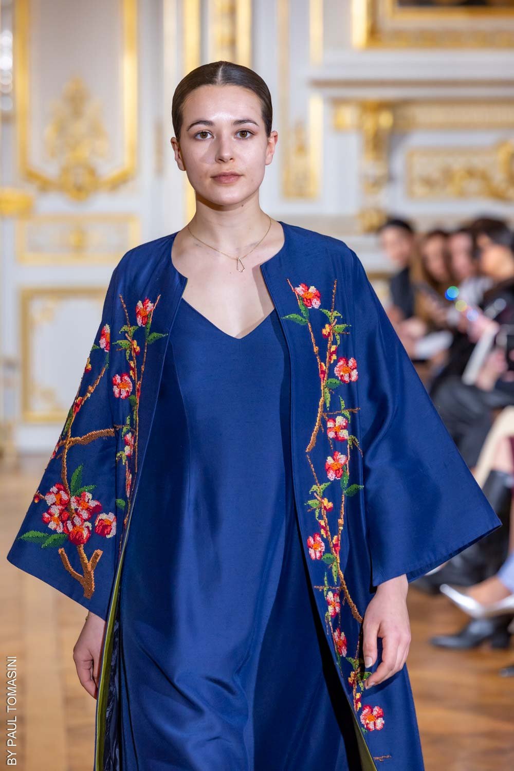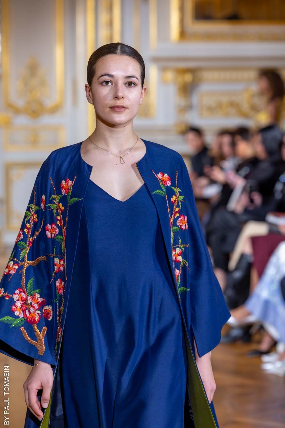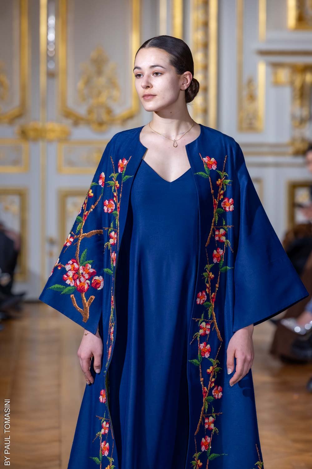 The “Night Blossom” abaya features delicate embroidery and beading, flowing gracefully over a sleek navy dress for a look that blends elegance with modern edge.